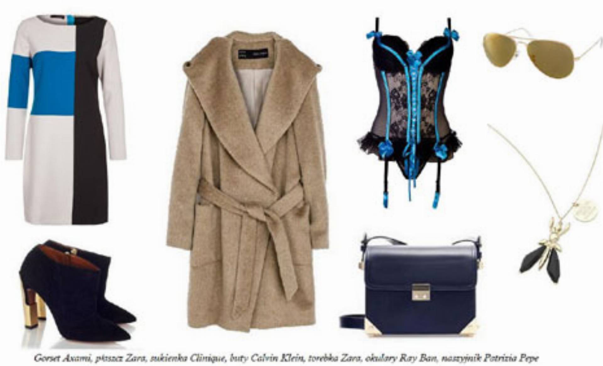Dla tych mniej odważnych proponujemy klasyczny płaszcz w kolorze, który nigdy nie wychodzi z mody. Camel jest ponadczasowy i kochają go wszystkie kobiety. Szalowy kołnierz i pasek w talii potrafią pięknie modelować sylwetkę, a kaptur ochroni nas przed deszczem lub śnieżycą. Uwagę przykują ciekawe botki z nietypowym zdobieniem na obcasie oraz torebka z okuciami. Pod płaszcz możemy założyć prostą sukienkę, której forma nabiera charakteru ze względu na ciekawe połączenie tkanin i kontrastujących kolorów. Pod nią idealnie sprawdzi się gorset, który nie odznacza się pod ubraniem, jednocześnie dodając seksapilu. Propozycja od marki Axami jest strzałem w dziesiątkę, niebywale kobieca i seksowna.