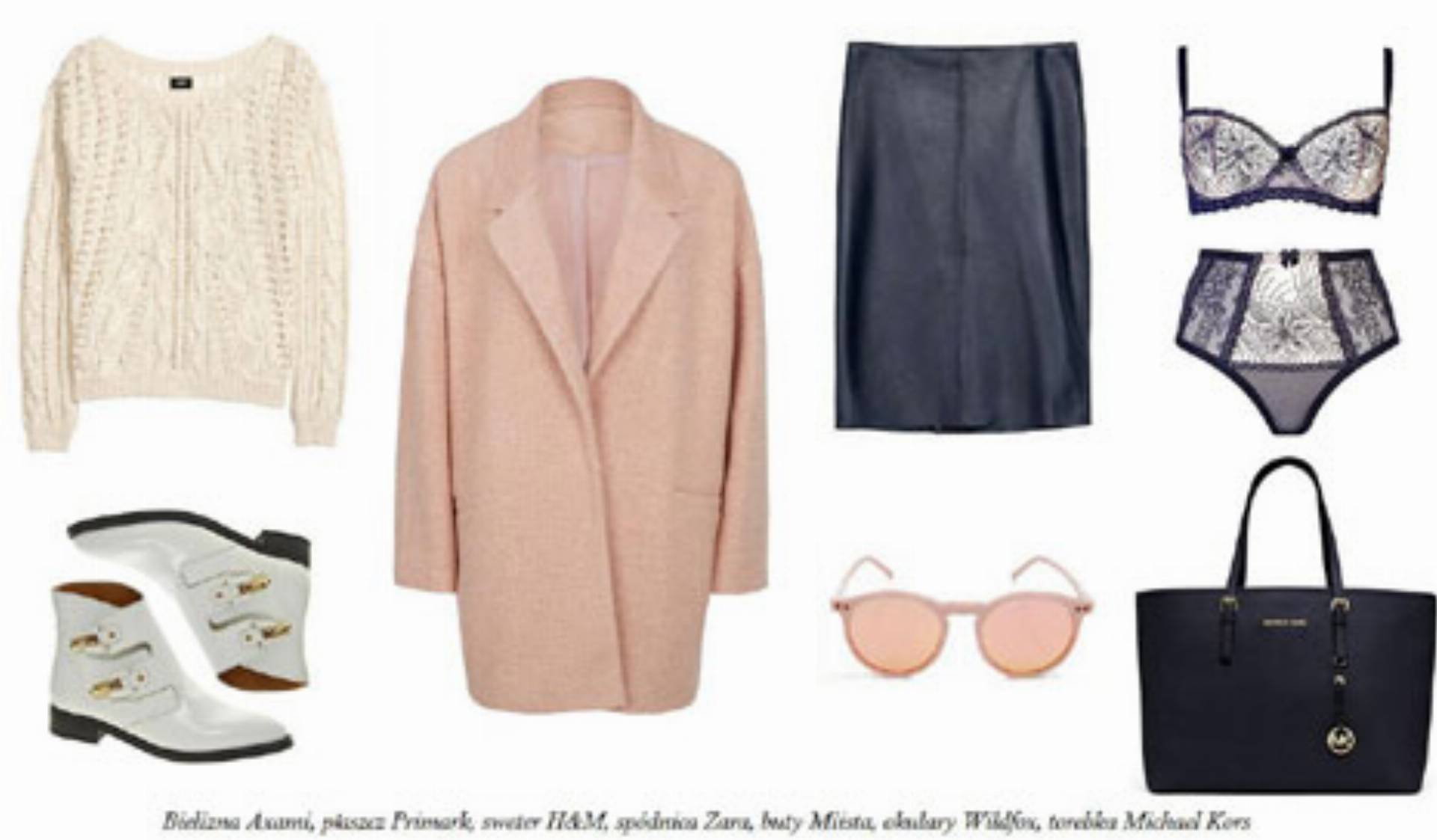 Niewątpliwie bardzo ciekawymi, a jednocześnie bardzo trudnymi do noszenia kolorami w okresie zimowym są odcienie pastelowe i landrynkowe. Mocnym trendem w tym sezonie jest płaszcz w kolorze pastelowego różu lansowany między innymi przez Celine. Połączenie ascetycznego kroju oversize i delikatnego koloru jest bardzo kobiece. Z pewnością wzbudzi zainteresowanie w zestawieniu z miłym sweterkiem o pięknym splocie oraz mocną skórzaną spódnicą w kontrastującym kolorze. Jasne buty z ozdobnymi klamrami dopełnią stylizację. Do tego zestawu idealnie sprawdzi się duża torba typu shopper, a wisienką na torcie będą optymistyczne różowe okulary i efektowna bielizna Axami. Figi z wyższym stanem zapewnią wygodę, wymodelują delikatnie sylwetkę, a cudownie zdobiony biustonosz podtrzyma i pięknie wyeksponuje biust.