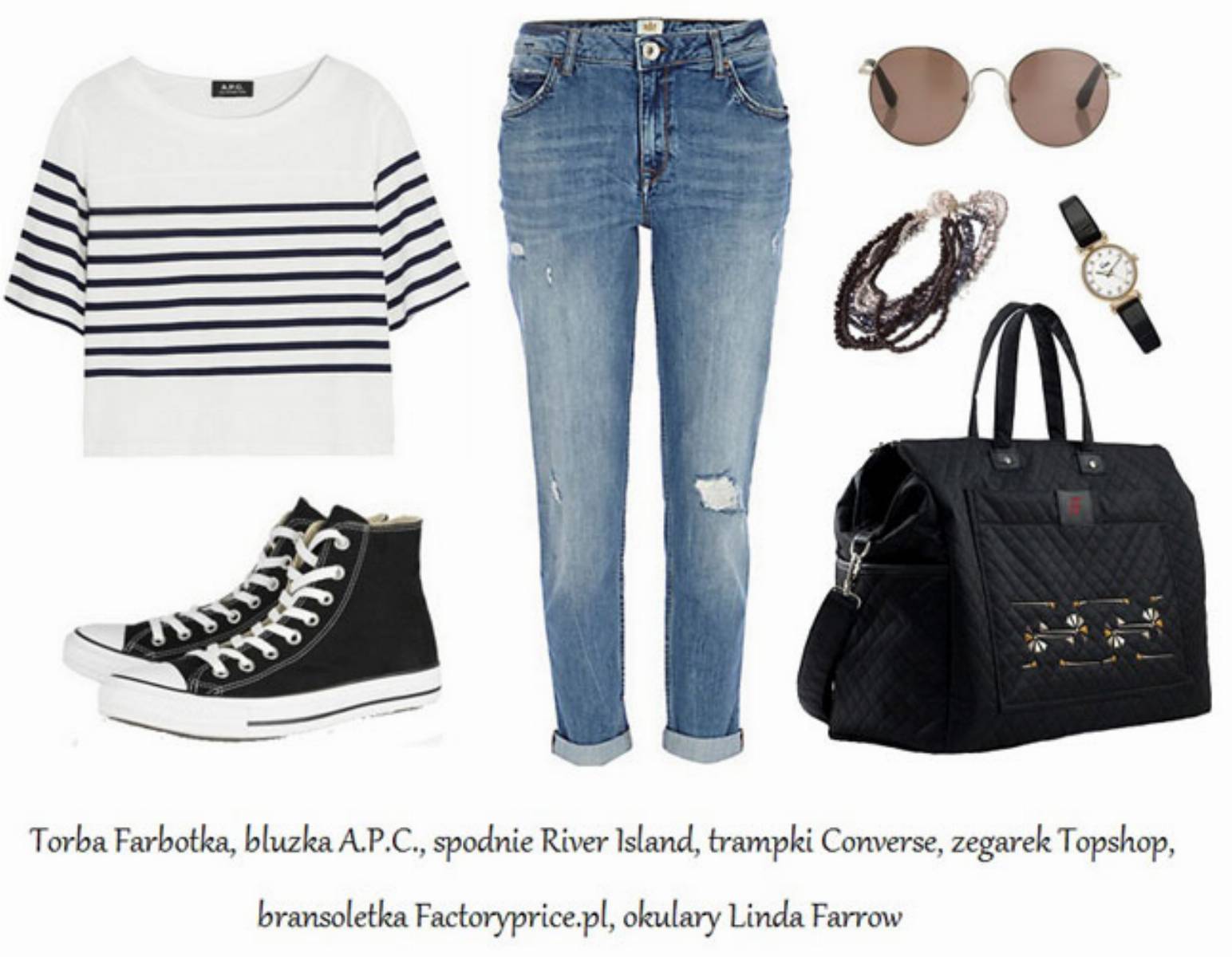 Look w stylu Kendall Jenner to propozycja dla kobiet, które nie lubią intensywnych kolorów i które stawiają na wygodę. Spodnie jeansowe typu boyfriend wraz z białą bluzką w poziome pasy oraz trampkami stworzą wygodny zestaw w sam raz na spacer. Duża, pojemna torba wykonana z wodoodpornego materiału pomieści wszystkie niezbędne rzeczy. Zestaw ten doskonale dopełnią stylowe okulary, klasyczny zegarek oraz bransoletka.