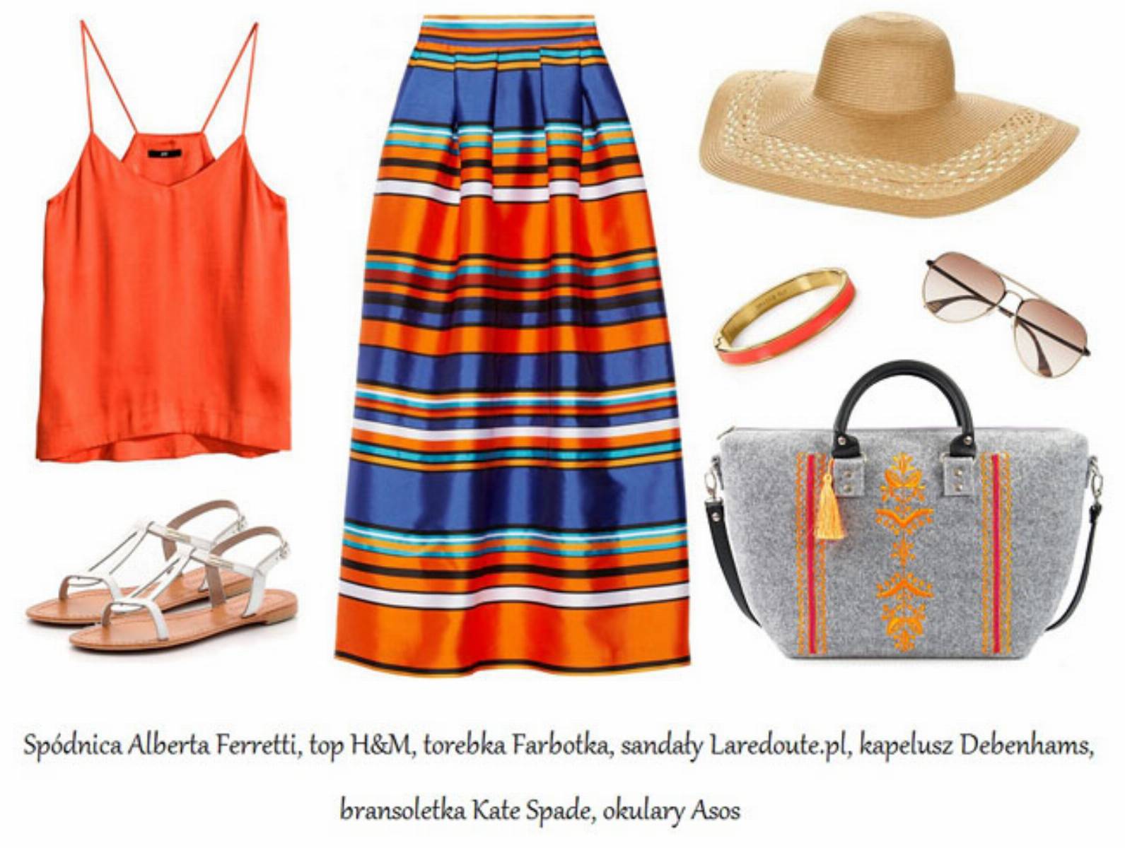 Soczyste barwy jak pomarańcz to jeden z najgorętszych trendów tego sezonu! Właśnie dlatego nie mogło zabraknąć go wśród naszych propozycji. Pomarańczowy top stworzy zgrany duet z ozdobioną paskami spódnicą. Filcowa torba marki Farbotka z pomarańczowym haftem doskonale się z nimi skomponuje. Świetnym dopełnieniem tego iście wakacyjnego zestawu będą białe sandały, kapelusz z szerokim rondem oraz okulary przeciwsłoneczne typu aviator.