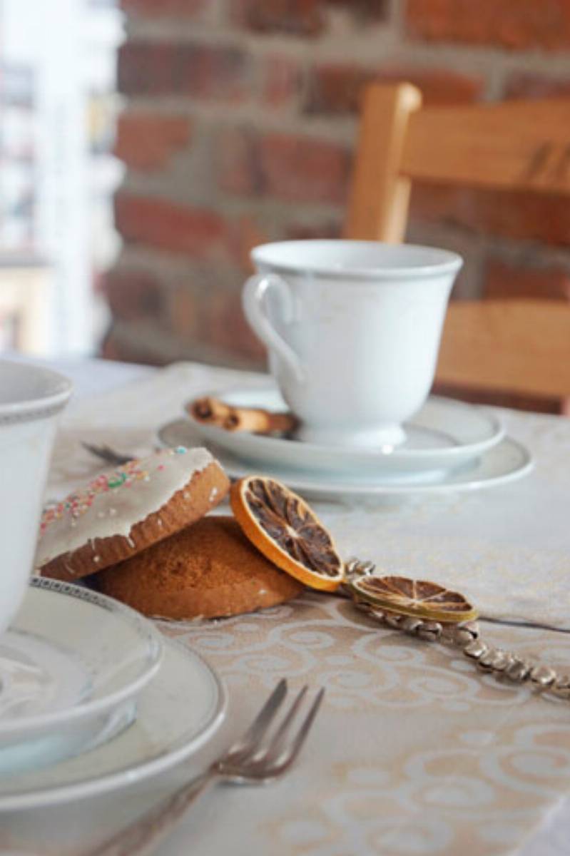 2. Jeśli zależy nam na odświeżeniu tradycyjnego wyglądu stołu, warto przełamać jednorodną połać obrusa wąskim paskiem tkaniny w złotym lub srebrnym kolorze. Tak przygotowany, oryginalny bieżnik doda dekoracji elegancji i wyrazistego charakteru.