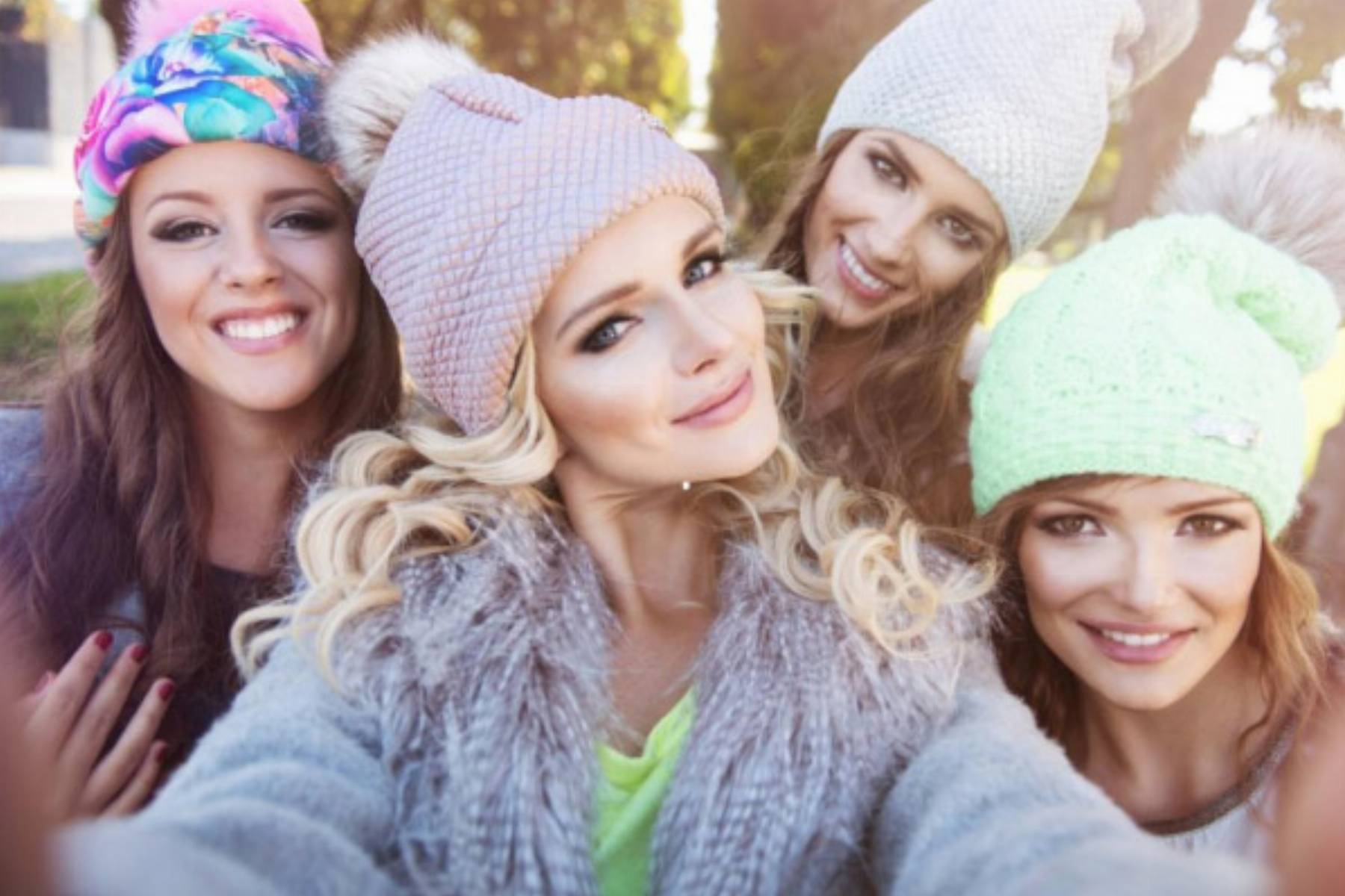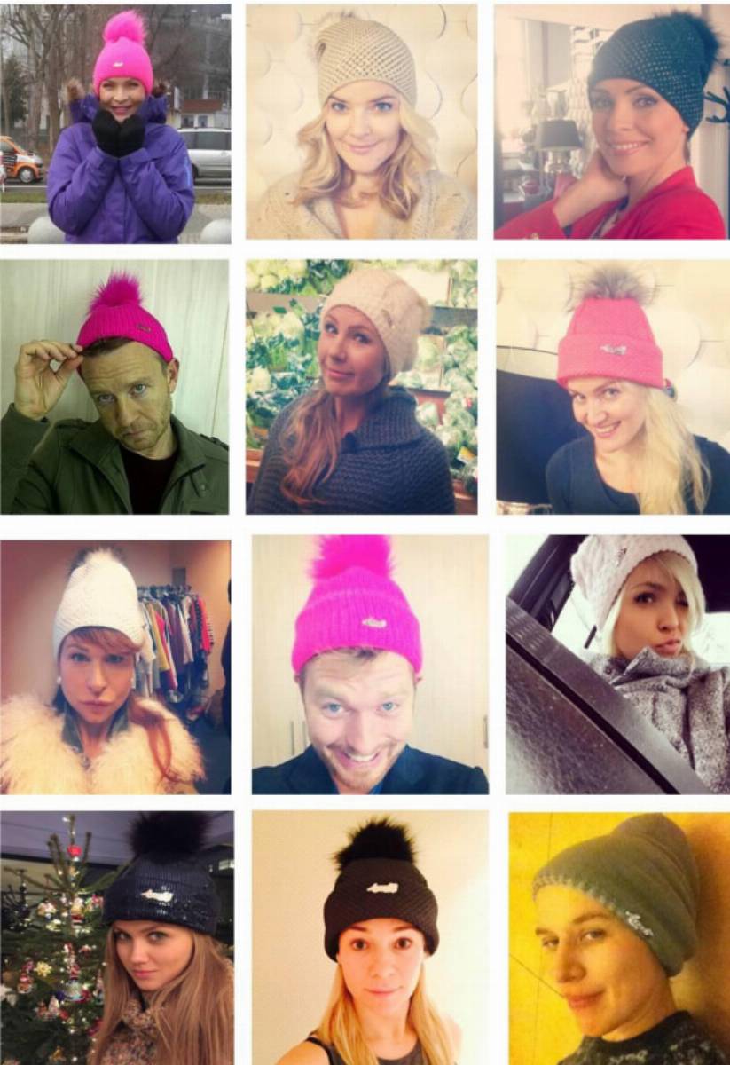 Gwiazdy fotografują się w czapkach przeznaczonych do licytacji.