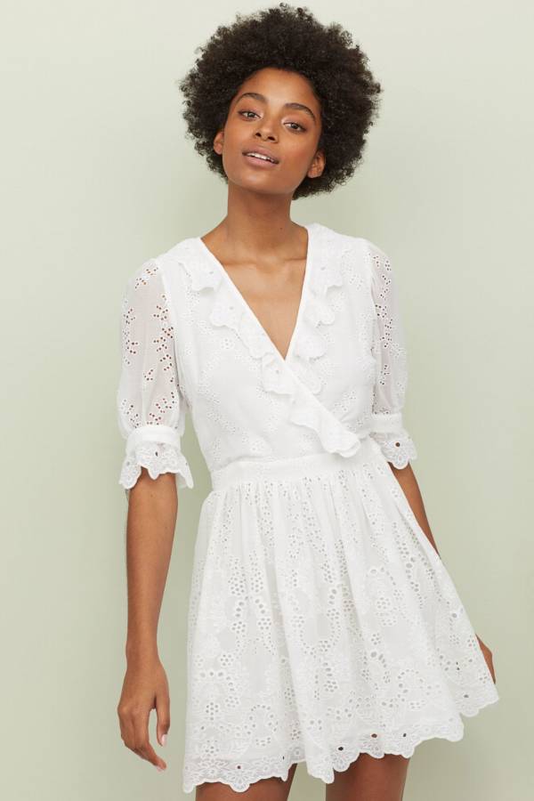 Ozdobna biała sukienka z falbankami, ażurami i haftami – H&M, 279,99 zł