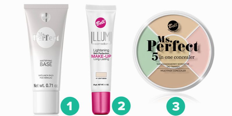 Makijaż rozpocznij od klepania matującej bazy Mattifying Makeup Base (1) która wygładzi skórę i przedłuży trwałość podkładu. W tym trendzie stawiamy na lekkość wykończenia, więc jeżeli stan Twojej skóry na to pozwoli- wybierz delikatny fluid o rozświetlających właściwościach, np. Illumi corrector (2). Zaaplikuj go omijając okolicę oka, gdzie w celu odświeżenia twarzy nałożymy najjaśniejszy korektor z paletki Ms. Perfect 5 in one concealer (3).