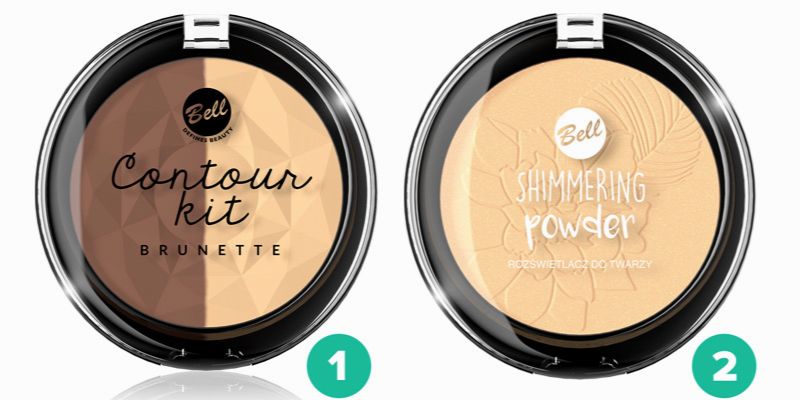 Wykonturuj kości policzkowe aplikując kolistymi ruchami puder brązujący Contour Kit (1). Ten makijaż ma być szybki i łatwy w wykonaniu więc możesz pominąć etap nakładania różu. Zrezygnuj z mocnych, metalicznych rozświetlaczy na rzecz subtelnego rozświetlenia jakie zapewni Ci rozświetlacz Shimmering Powder (2), który mieni się niczym własna skóra. Nałóż go na skroń, szczyt nosa, łuk kupidyna oraz na powiekę ruchomą oka.
