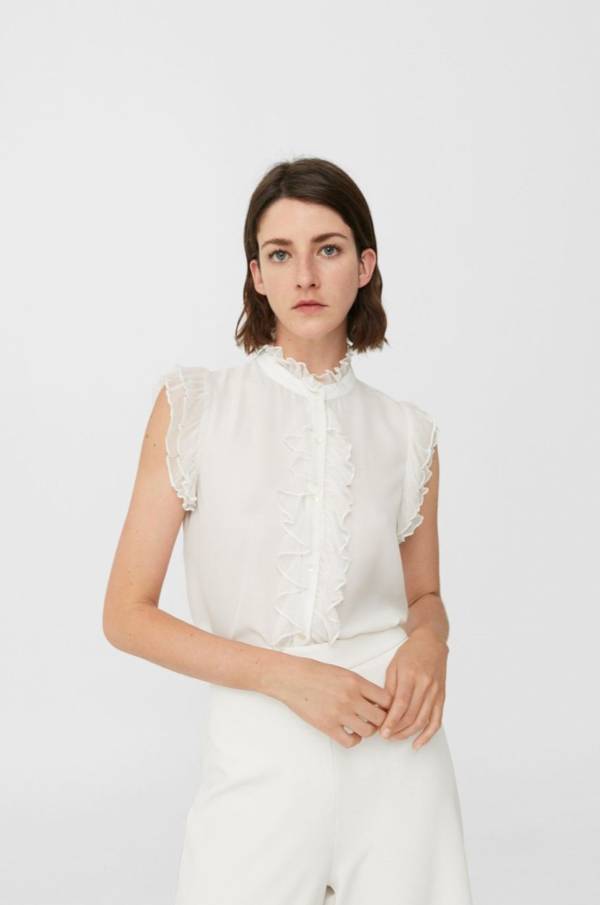 „Pinky”, półprzezroczysta bluzka z falbankami i krótkim rękawkiem – Mango, 119,90 zł