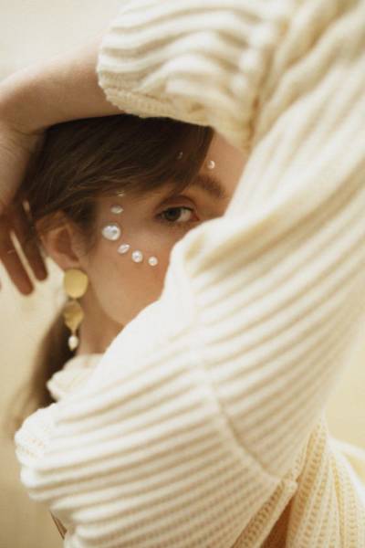 Przyklejane wzdłuż kości policzkowej i na skroniach perełki to już bardziej ekstrawagancka ozdoba, która raczej nie sprawdzi się do outfitu, który założysz do pracy. Na szczęście nie jest to jedyne miejsce, które jest twoim celem wyjścia z domu. Trwa jeszcze karnawał, a poza nim może nadarzyć się wiele innych specjalnych okazji. Z doklejonymi perełkami pięknie korespondują złote kolczyki z perłowym dodatkiem.