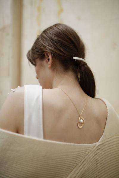 Naszyjniki możemy dziś nosić na setki sposobów. My proponujemy wisiorek zawiesić na plecach. Wyjątkowe miejsce niech wyeksponuje dla niego sweter z odwróconym dekoltem lub zawieszony luźno na ramionach. Jeżeli pojawi się tam dodatkowo perła otoczona finezyjnym złotym kształtem, na pewno zrobicie wrażenie. Ciekawym dodatkiem do takiej stylizacji może być też wpięta we włosy spinka w perłowym odcieniu. Kosmyki powinny bowiem zostać związane, tak aby ukazać ozdobę na plecach.