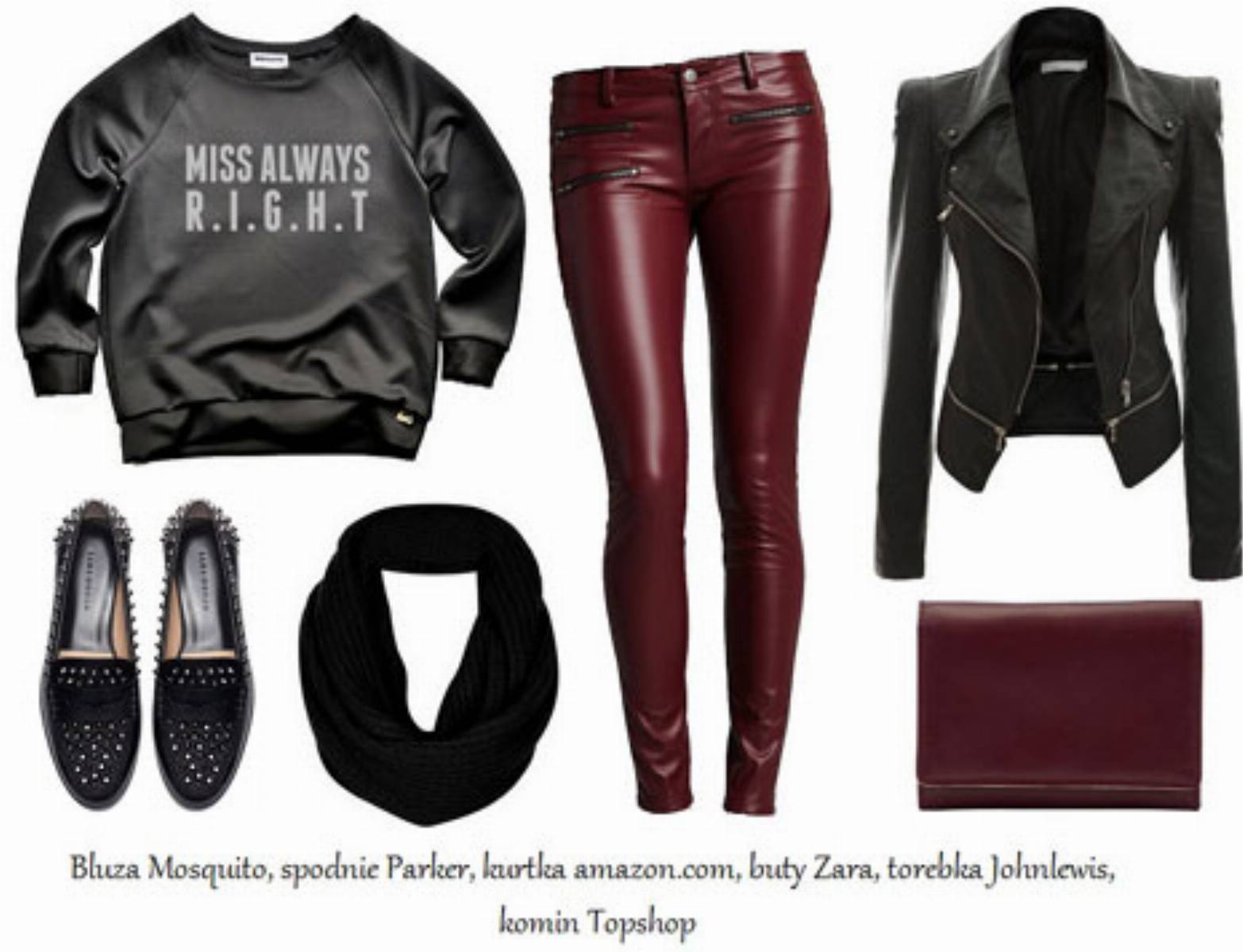 Wygodnie i z charakterem. Właśnie ta przedstawia się nasza ostatnia propozycja, czyli połączenie czarnej bluzy z napisem Always miss R.I.G.H.T. z bordowymi rurkami, ozdobionymi ćwiekami mokasynami, a także skórzaną ramoneską, prostą kopertówką i czarnym kominem. Jak Wam się podoba?