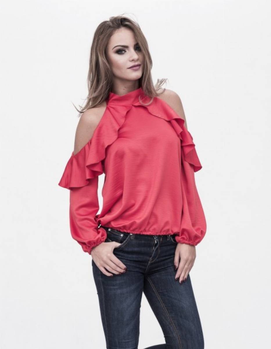 Koralowa bluzka z długim rękawem i falbanami – FiFi designe, 119,20 zł