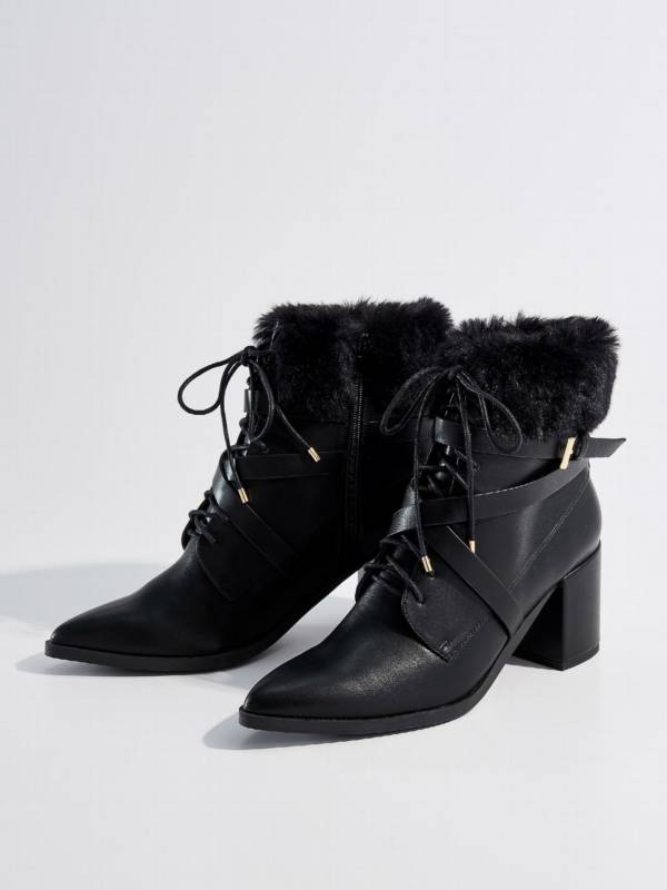 Czarne botki z ozdobnym futerkiem i paseczkami