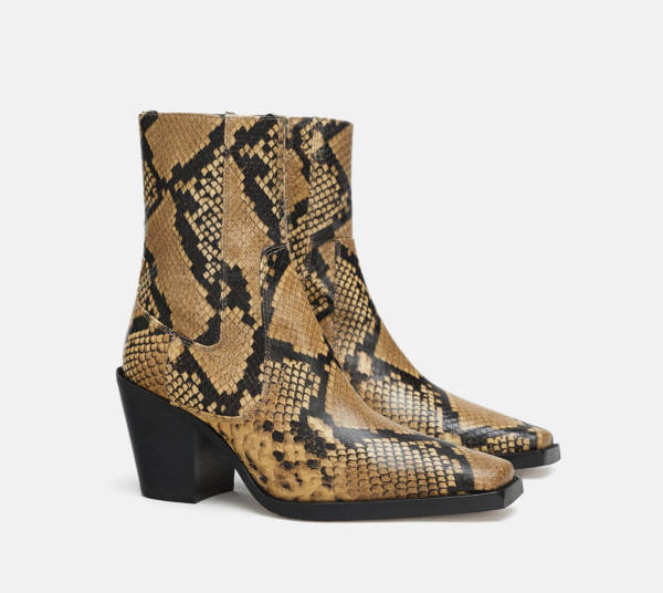 Botki w wężowy wzór o naturalnej kolorystyce – ZARA, 399 zł