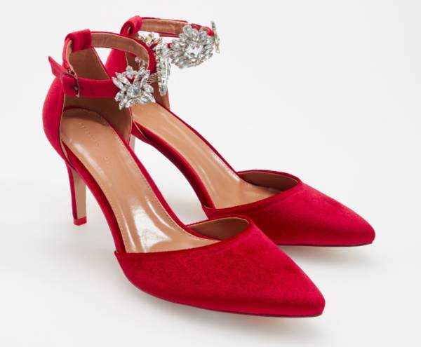 Czerwone czółenka-sandałki z biżuteryjną ozdobą, zapinane wokół kostki – Reserved, 99, 99 zł