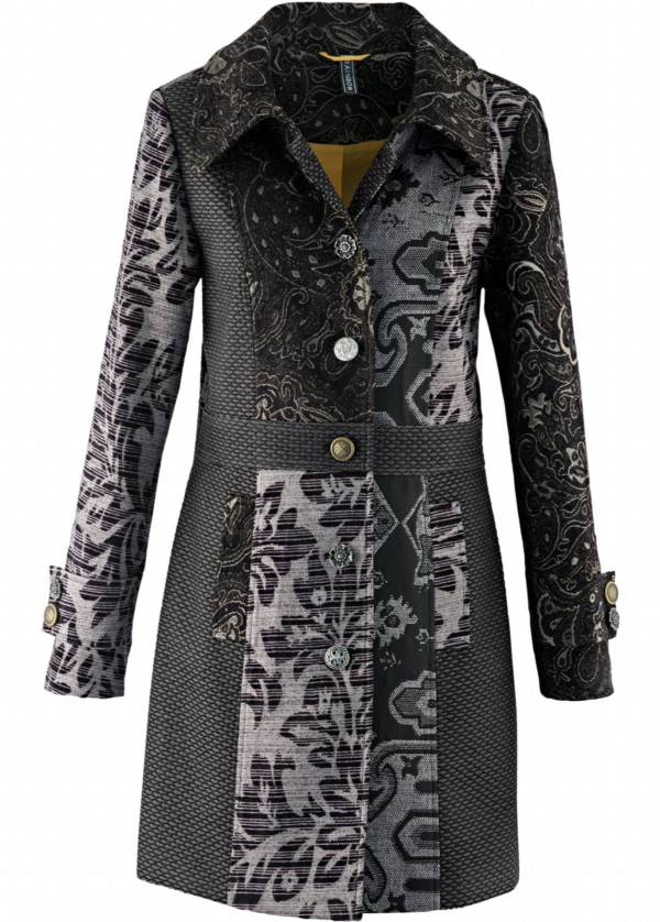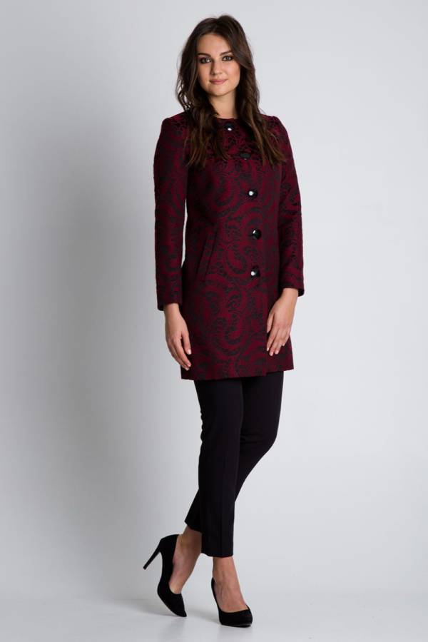 Czarny płaszczyk z bordowymi tłoczeniami zapinany na guziki – Bialcon, 235 zł