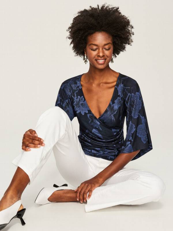 Granatowa bluzka w błyszczące kwiaty, o kopertowym fasonie – Reserved, 79,99 zł