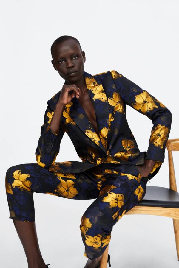 Kwiecisty żakardowy garnitur – Zara (marynarka – 249 zł, spodnie – 139 zł)