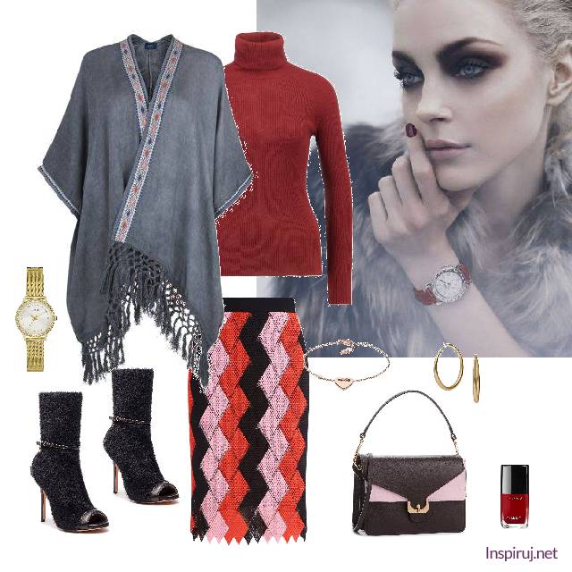 W pierwszej stylizacji burgundowy golf i spódnica ołówkowa rosa nawiązują do jesiennej palety barw. Oryginalny wzór i wykończenie spódnicy dodają kreacji nietuzinkowości. Zgrabnie układające się na stopie botki wysmuklą całą sylwetką, nadając jej powabu i wyrafinowania. Zaś eleganckie dodatki podkreślą wagę spotkania. Jako dopełnienie całości narzucamy siwe ponczo, zdobione wzorzystą taśmą i wykończone ażurem z frędzlami.