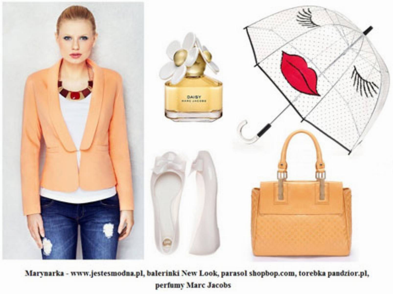Ostatnia nasza propozycja to połączenie soczystej pomarańczy z bielą. Dzięki eleganckiemu żakietowi ze sklepu Jestesmodna.pl rozświetlisz szarobure ulice i to w naprawdę dobrym stylu, przykuwając uwagę wszystkich przechodniów. Pomogą Ci w tym gumowe balerinki ozdobione uroczą kokardką, duża pojemna torba na ramię oraz szalenie modny parasol z czerwonymi ustami. Przed wyjściem z domu spryskaj się jeszcze ulubionymi perfumami i ruszaj na podbój miasta!