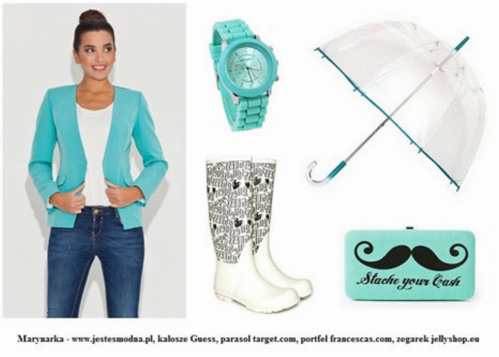 Turkus to jeden z najgorętszych kolorów tego sezonu, a to oznacza, że skąpana w nim marynarka ze sklepu Jestesmodna.pl to obowiązkowy must have w Twojej szafie! Po zestawieniu jej z białym topem i jeansami powstanie bezpieczna i stonowana stylizacja, której charakteru bez wątpienia dodadzą białe kalosze ozdobione czarnym printem, ogromny, przezroczysty parasol z turkusowymi akcentami, portfel ze słynnymi wąsikami, a także designerski zegarek!