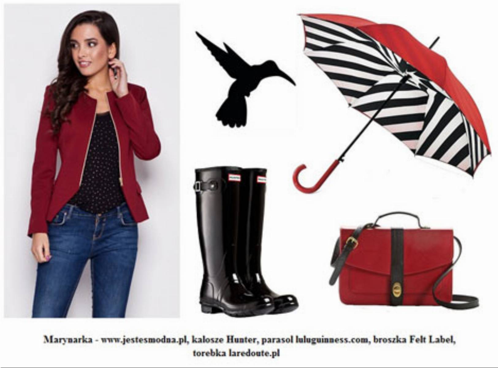 Klasyczne połączenie czerwieni z czernią sprawdza się zawsze i wszędzie, także podczas ulewnych deszczy. Właśnie dlatego warto na nie postawić szykując się do wyjścia z domu. Idealnym dopełnieniem jeansów i czarnego topu będzie więc stylowy żakiet o oryginalnym i dość ciekawym kroju, który doskonale zaakcentuje talię. Ochronę przed deszczem zapewni ciekawy parasol z czarno-białymi pasami po wewnętrznej stronie, a przed kałużami – kultowe Huntery. Torebka na długim pasku pomieści kobiece drobiazgi, a broszka w kształcie kolibra doda całości dziewczęcego uroku.