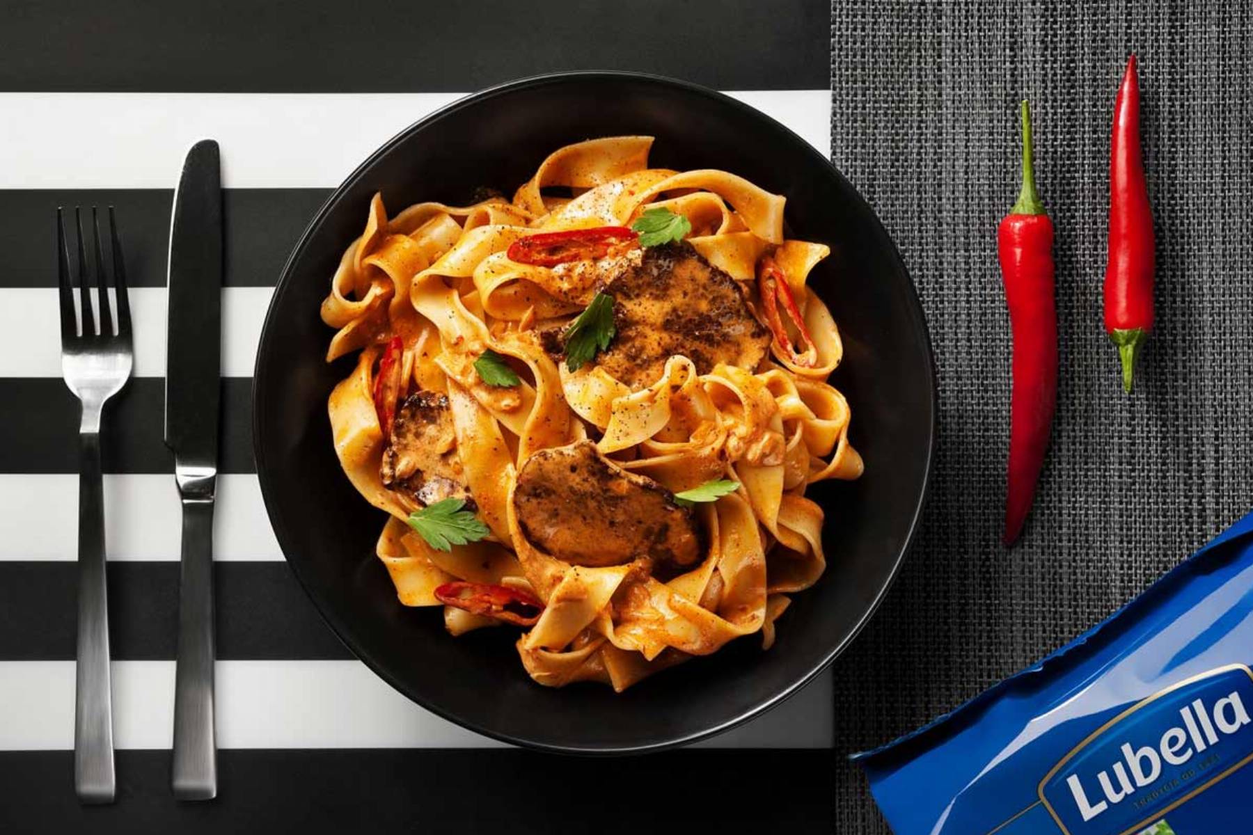 - Po 30 sekundach dolej śmietanę, dodaj sól i pieprz, a następnie gotuj jeszcze całość przez ok. minutę. Gdy sos lekko zgęstnieje dodaj do niego makaron Lubella. Całość posyp posiekaną natką pietruszki i grubo mielonym pieprzem.