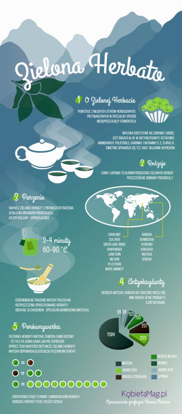 O zielonej herbacie można powiedzieć wiele, ma ona bowiem bogatą, wielowiekową tradycję, z którą wiąże się wiele ciekawostek. Chińczycy – którzy wynaleźli wszystkie znane rodzaje herbaty począwszy od białej, poprzez żółtą, zieloną, ulung, czarną, aż po pu-erh – od zawsze traktowali zieloną herbatę jako najszlachetniejszy napój pod słońcem. Nie tylko pili ją, ale też pisali o niej poematy, rozprawy medyczne, a nawet traktaty religijno-filozoficzne. W Japonii powstał na jej cześć słynny, praktykowany do dziś rytuał Drogi Herbaty Cha-do. Jej magia zawładnęła także wyobraźnią Maghrebu. Marokańskie kobiety przygotowują ją w małych, ozdobnych szklaneczkach ustawionych na srebrnej tacy, dodając do naparu liście mięty. Ta uczta to symbol gościnności – odbywa się zazwyczaj na kolorowym, zdobnym we frędzle dywanie. Zdziwienie turystów podróżujących przez Saharę budzi z kolei Timia – ceremonia, podczas której Beduini gawędząc, popijają zieloną herbatę i podgryzają wypiekane w piasku placki zbożowe z dodatkiem skwaśniałej serwatki oraz papkowatej kessery (herbaty z masłem i miąższem suszonych moreli).