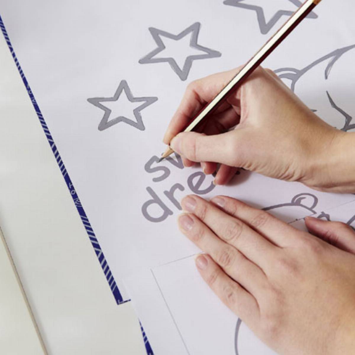 Wykorzystaj nasz szablon lub wykonaj swój własny na kartce A3. Na tym etapie możesz puścić wodze fantazji. Za pomocą kalki i ołówka przenieś motyw na płytę mocowaną w nogach łóżeczka.