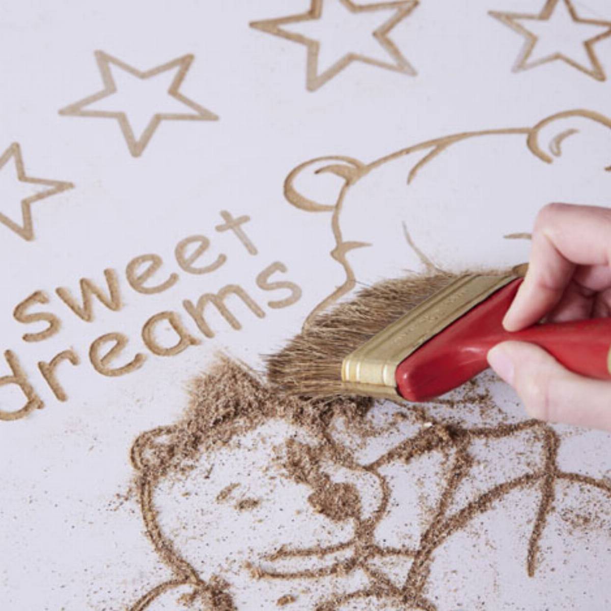 Teraz zdejmij szablon i za pomocą miękkiej szczotki zmieć pył z wygrawerowanego wzoru. Twoja pociecha może już słodko spać w swoim pięknie i oryginalnie przyozdobionym łóżeczku. Podobne wzory możesz także wygrawerować na innych meblach w pokoju dziecięcym.
