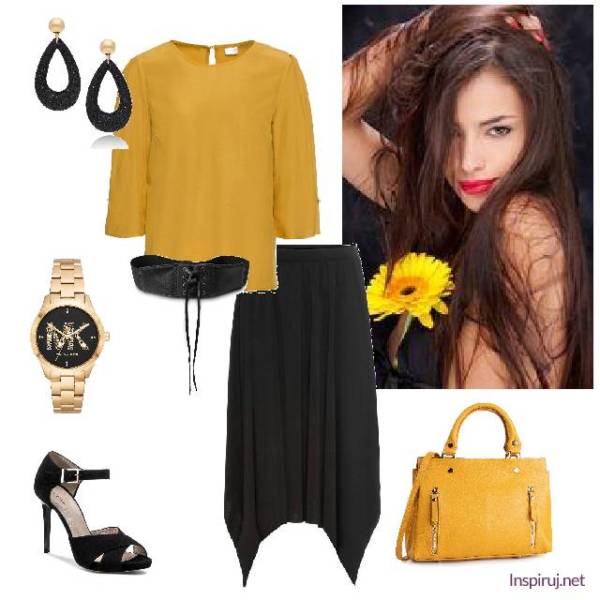 Pierwsza propozycja to zestaw z ultramodną w tym sezonie miodową żółcią, która powtarza się na szyfonowej bluzce oraz na torebce. Wiosenny i radosny odcień został przez naszą Inspirantkę zestawiony z czernią w postaci spódnicy o oryginalnym kroju z przedłużonymi bokami, gorsetowego pasa i bardzo kobiecych sandałków na wysokiej szpilce. Klasy dodają całości akcesoria, doskonale grające połączeniem żółtego złota i czerni – wiszące kolczyki-pętelki oraz zegarek na bransoletce.