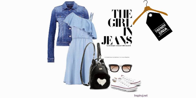 Zestaw składa się z ciemnej dżinsowej kurtki i jasnoniebieskiej sukienki z falbaną przy dekolcie oraz białych trampek. Stylizację uzupełniają ciekawe kocie dodatki – czarny plecak z uszkami i okulary kocie oczy. Outfit idealnie wpisuje się w hasztag #jeansowytotallok, łącząc różne odcienie i faktury denimu oraz ożywiając zestaw ciekawymi dodatkami. Stylizacja to idealna propozycja na co dzień – łączy najnowsze trendy z wygodą.