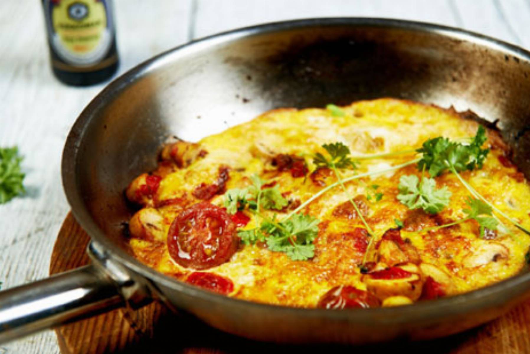 Ziemniaki i cebulę obrać, pokroić w półplasterki. Pieczarki oczyścić pokroić w cząstki. Ziemniaki można lekko podgotować. Jajka roztrzepać, dodać mleko i posiekaną natkę. Doprawić sosem sojowym, szczyptą soli i pieprzu. Na patelni rozgrzać olej, dodać cebulę pokrojoną w piórka, pieczarki, roztarty czosnek oraz ziemniaki. Wszystko zrumienić. Zdjąć z patelni i lekko ostudzić. Wymieszać dokładnie z jajkami. Następnie masę wyłożyć na rozgrzaną patelnię, wyrównać wierzch i smażyć na niewielkim ogniu. Kiedy całość prawie się zetnie, podważyć brzegi i poruszyć omletem. Przykryć patelnię talerzem i przy jego pomocy przewrócić omlet na drugą stronę. Dosmażyć. Omlet można podawać na ciepło lub na zimno.