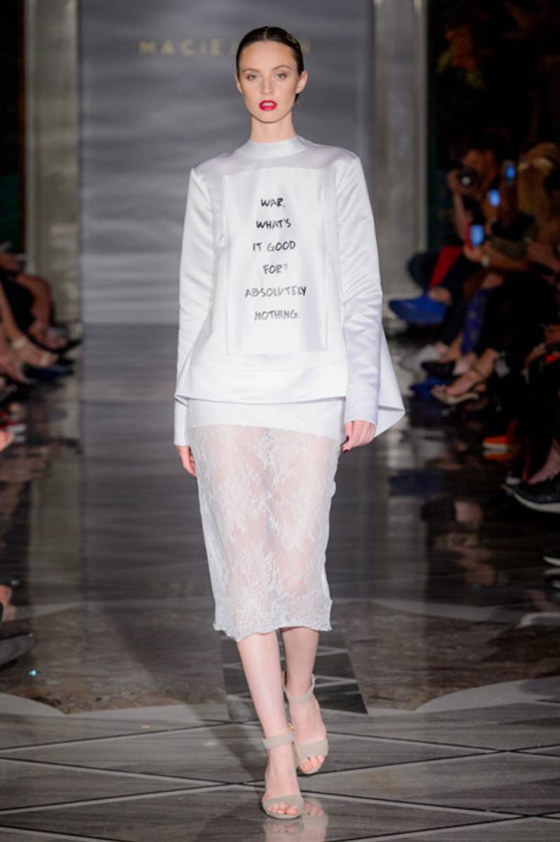 Sylwetki z pokazu dopełniały akcesoria : skórzane rękawiczki i biżuteria oraz bogato zdobione z wysokogatunkowej skóry torebki. Modelki prezentowały kreacje w butach marki Baldowski z kolekcji zaprojektowanej przez Macieja Zienia. Znaczącym i kluczowym dla pokazu momentem była ostatnia sylwetka – modelka zaprezentowała t-shirt z napisem „War ,what‘s it good for? Absolutely nothing!”. Projektant w ten sposób zwieńczył pokaz, który ilustrował niepokój panujący na świecie ze względu na napiętą sytuację polityczną.