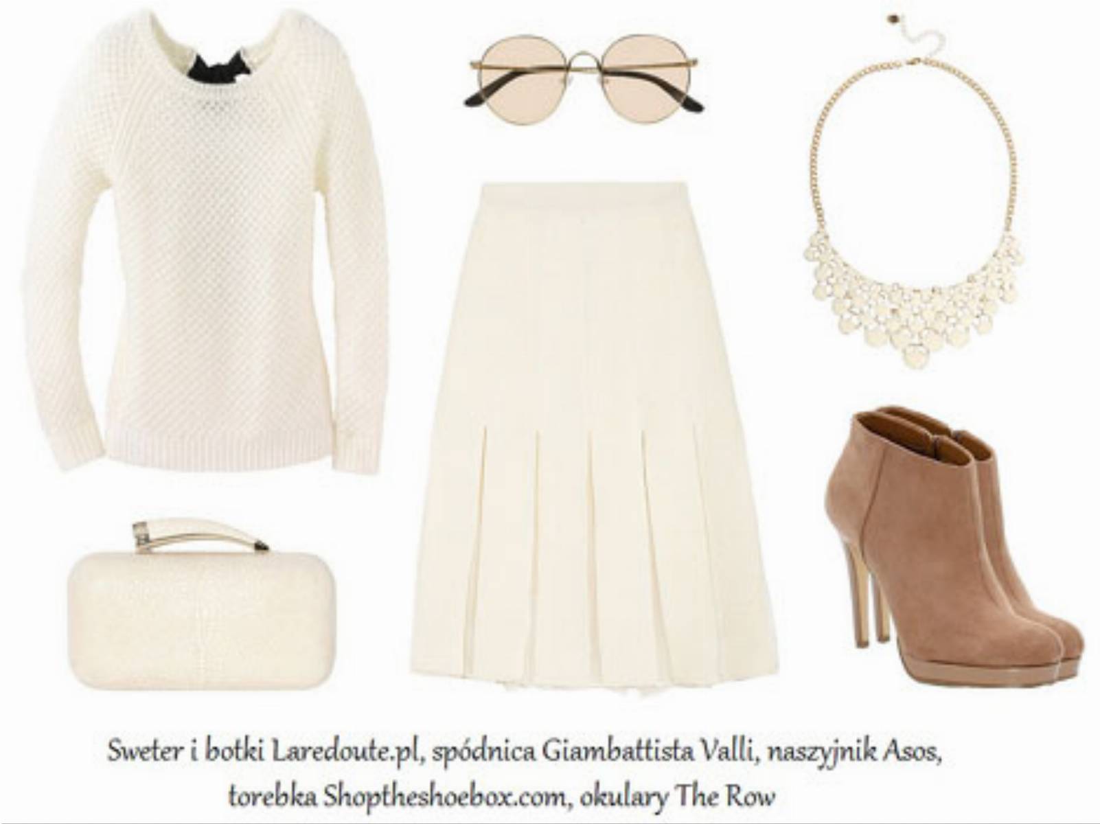 Do stworzenia kolejnej stylizacji zainspirowały nas skąpane w bieli minimalistyczne zestawy, które pojawiły się w jesiennych kolekcjach Dereka Lama, Proenza Schouler czy Tommy’ego Hilfigera. Biały sweterek ze sklepu Laredoute.pl będzie świetnie współgrał z prostą spódnicą z plisami, a także beżowymi botkami, które urozmaicą nieco ten look. Doskonały dopełnieniem tej stylizacji będą odpowiednie dodatki: oryginalna kopertówka, duży biały naszyjnik, a także okrągłe okulary. Jak Wam się podoba?
