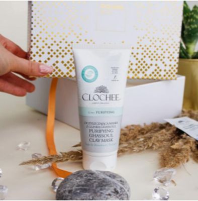 nią jedna z dwóch maseczek Clochee. Maseczka do twarzy z zieloną glinką ghassoul dogłębnie oczyszcza i rozjaśnia cerę, przywracając jej promienny blask. Posiada bardzo
