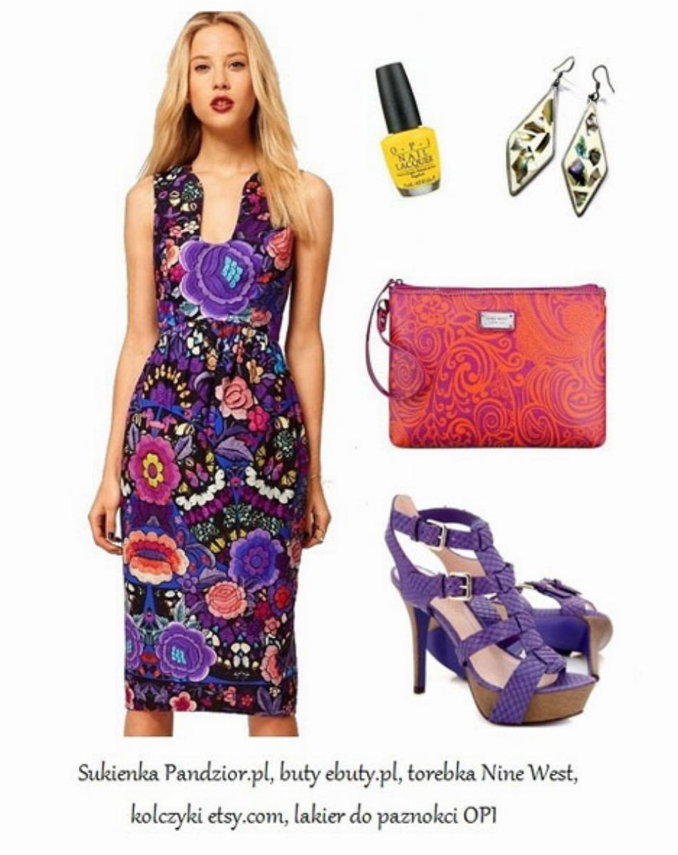 Jako, że uwielbiamy różnorodność i koloryt, który można spotkać na targach w Meksyku, to właśnie stamtąd zaczerpnęliśmy inspiracje do stworzenia kolejnej stylizacji. Tym razem króluje fiolet. To właśnie on zdominował tę nieco folkową, multikolorową sukienkę, która będzie świetnie współgrać z fioletowymi sandałkami z motywem wężowej skóry, kopertówką ozdobioną ciekawym wzorem, oryginalnymi kolczykami oraz oczywiście żółtym lakierem na paznokaciach! Co Wy na to?