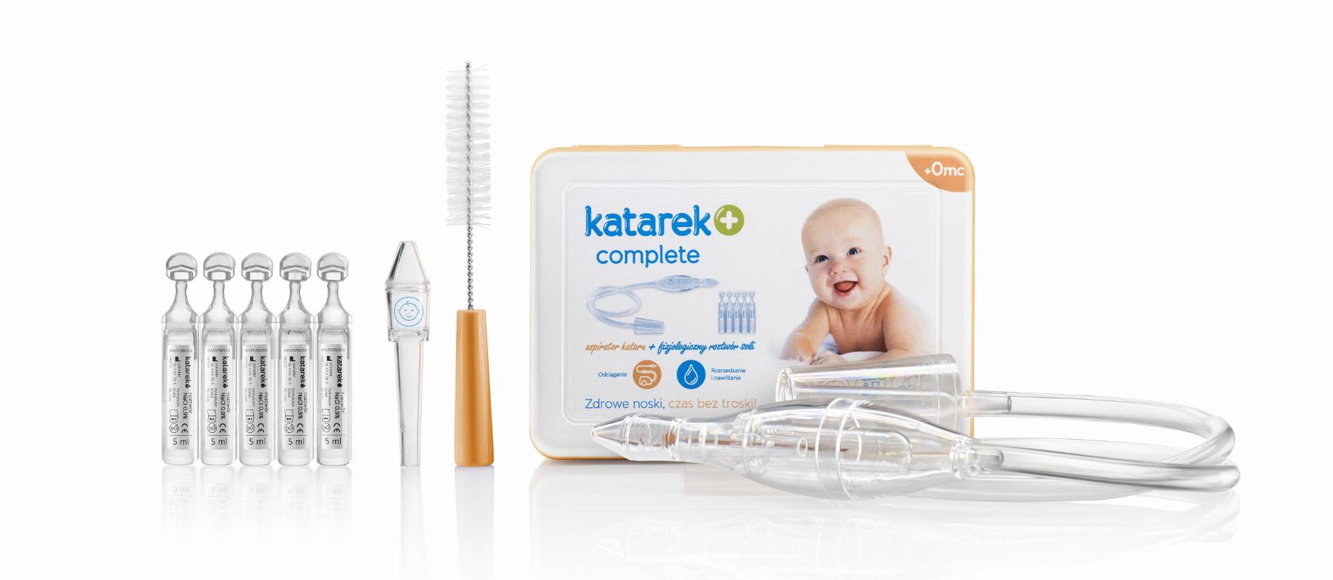 KATAREK + Complete jest skuteczną metoda walki z katarem u najmniejszych dzieci. Z nim w trzech prostych krokach bezpiecznie usuniesz wydzielinę z noska dziecka już od 1-go dnia życia. Pełny zestaw zawiera aspirator kataru podłączany do odkurzacza oraz ampułki fizjologicznego roztworu soli. Całość zamknięta jest w trwałym, plastikowym opakowaniu, zachowującym higieniczność produktu. Odsysacz jest odpowiedni do odkurzacza o mocy 800-1800W. Jego jednostajna siła ssąca wykorzystuje moc odkurzacza, umożliwia ona w połączeniu z użyciem soli fizjologicznej 0,9% bezpieczne oczyszczanie noska.
