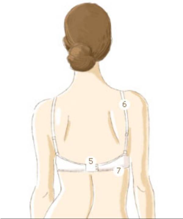 6. Ramiączka biustonosza są do siebie równoległe lub układają się w kształcie litery V. Ramiączka są lekko napięte, ale nie wpijają się w ramiona. Ramiączka przylegają do ciała i nie wrzynają się w ramiona