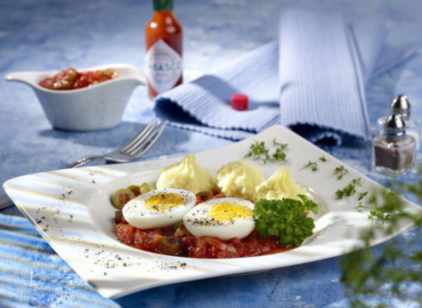 Obrać cebulę, pokroić w drobną kostkę i zeszklić na maśle. Dodać posiekany czosnek. Pomidory sparzyć we wrzątku, obrać ze skórki i oczyścić z gniazd nasiennych. Następnie pokroić w średnią kostkę i wrzucić na patelnię. Podlać białym winem i dusić kilka minut. Pod koniec smażenia dodać pokrojone w plastry oliwki i posiekaną bazylię. Doprawić do smaku sosem sojowym Kikkoman, szczyptą cukru i świeżo mielonym czarnym pieprzem. Dla nadania ostrości dodać kilka kropli TABASCO® Original. Jajka obrać, przekroić na połówki i ułożyć na gorącym sosie z pomidorów. Podawać z maślanym puree ziemniaczanym.
