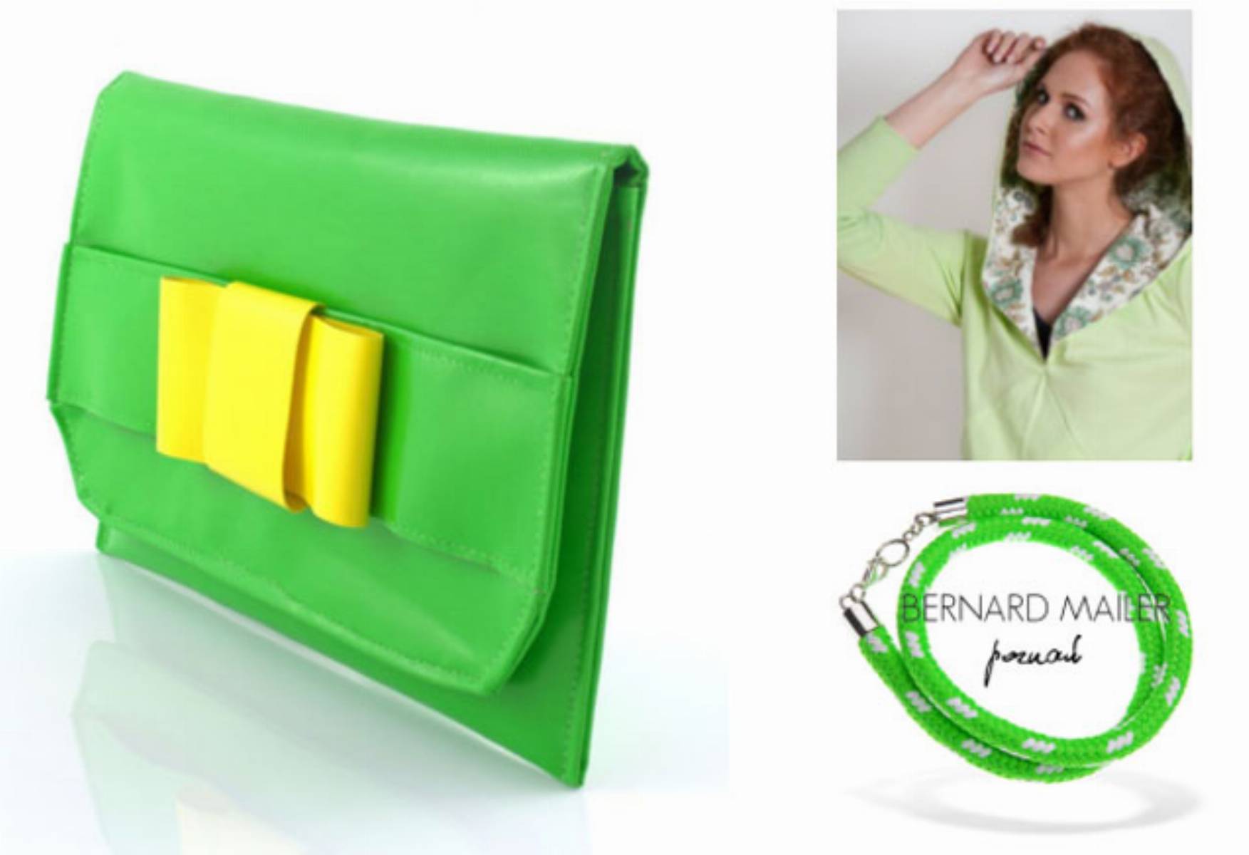 Oto coś dla miłośniczek soczystej zieleni – torebka recyklingowa marki ecoMania wytworzona z materiału pochodzącego z hal namiotowych, bluza OCEecostreetwear z bawełny organicznej z wstawkami tkanin upcyklingowych oraz ekskluzywna bransoletka z linek żeglarskich Bernard Mailer.