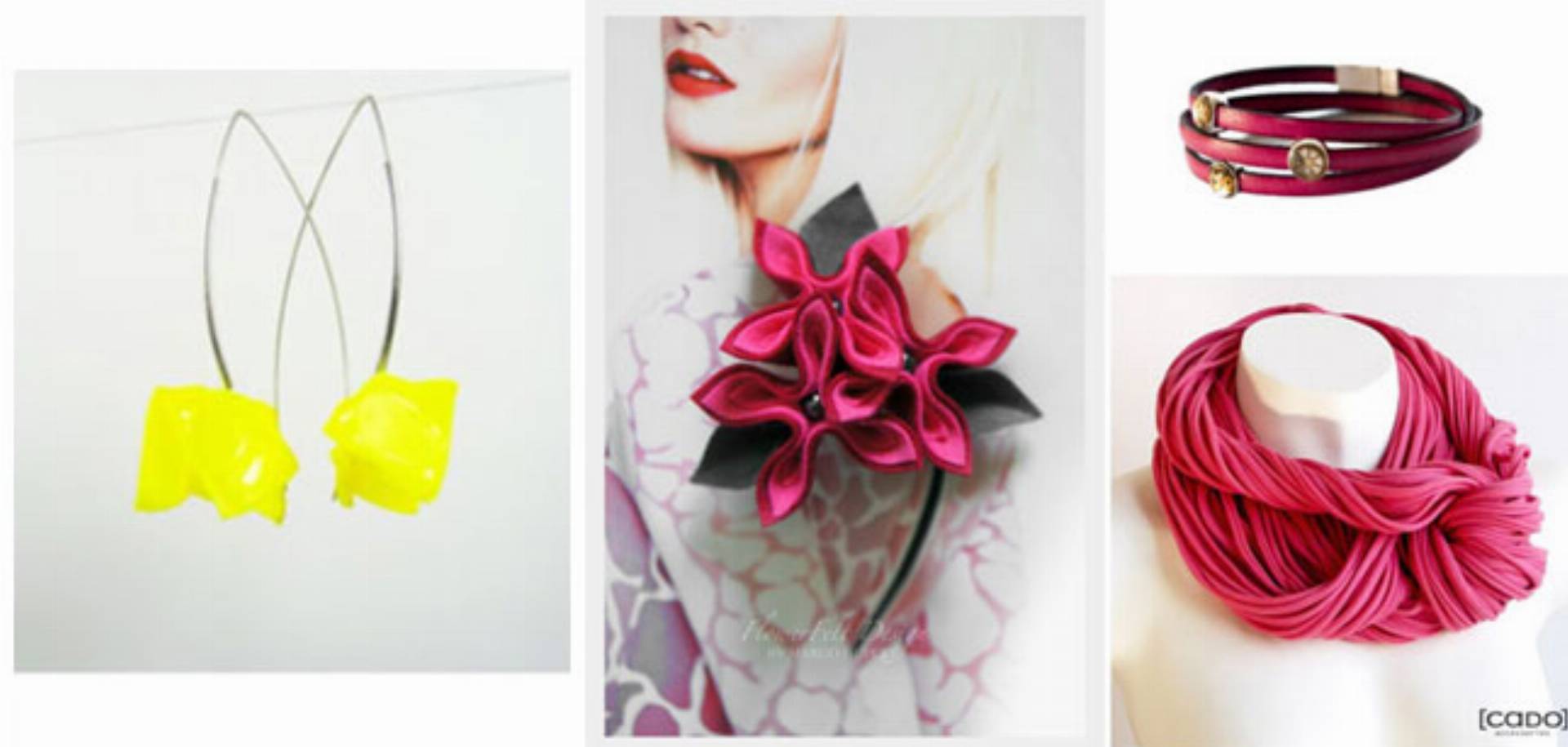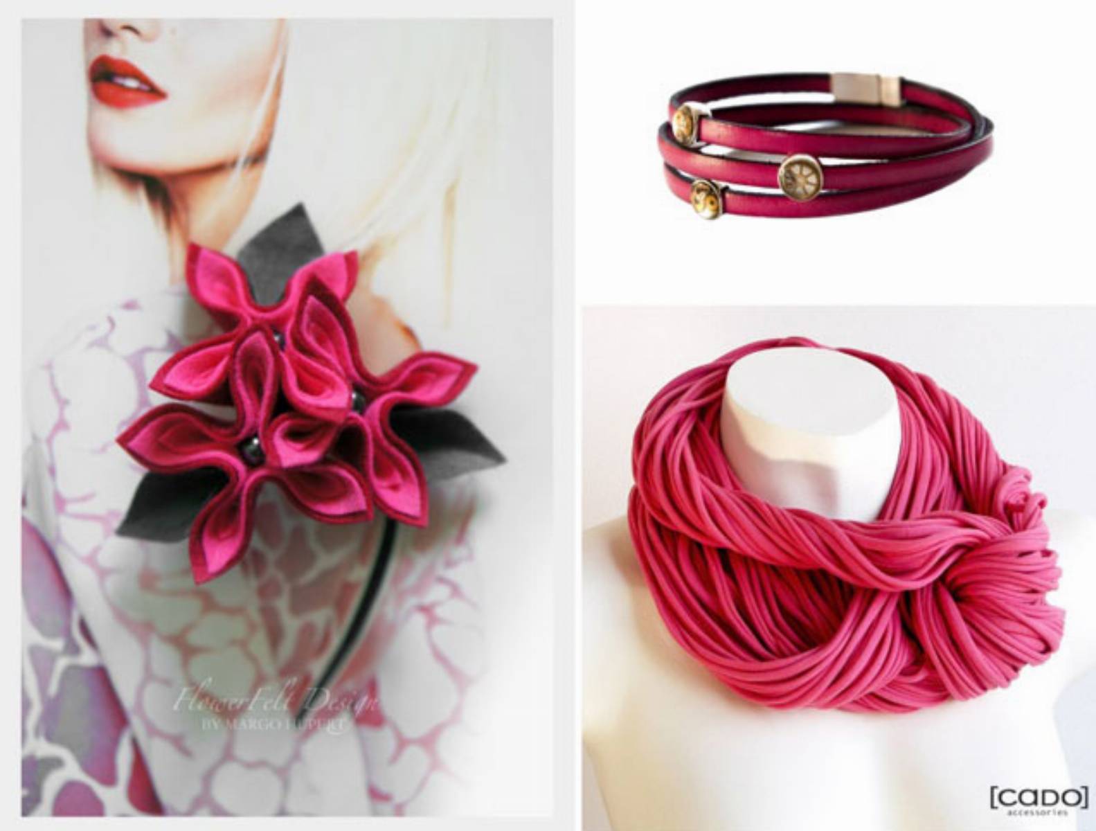 Ostatnia propozycja – w najmodniejszym kolorze fuksji – to kwiatowa broszka z filcu od Felt Label, upcyklingowa bransoletka z mechanizmami zegarkowymi Fanny&Franz oraz zamotka w kolorze fuksji Cado.