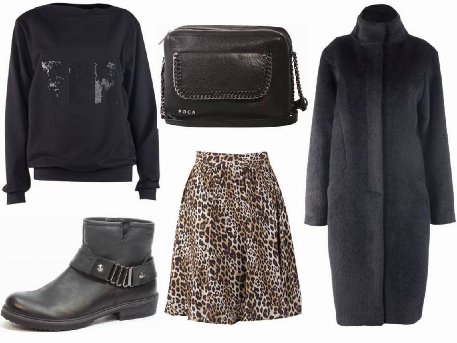 Bluza – Rabarbar/rabarbar.co, płaszcz – Bialcon/bialcon.pl, spódnica – Bialcon/bialcon.pl, buty – Caprice/caprice.pl, torebka – Boca/boca.pl.