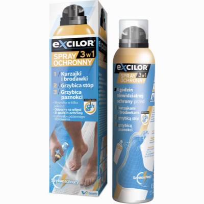 1. Aby ochronić się przed zarażeniem stosuj Excilor spray ochronny 3w1. Chroni on stopy przed grzybicą stóp, grzybicą paznokci oraz powstaniem kurzajki na stopie. Wystarczy spryskać stopy cienką warstwą i odczekać kilka sekund. Szybko się wchłania, nie pozostawia śladów na ubraniu i łatwo zmywa się wodą z mydłem. Preparat chroni skórę przez co najmniej 8 godzin.