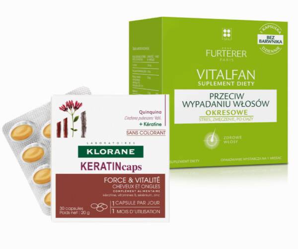 - Klorane KeratinCaps na wzmocnienie włosów i poprawienie ich witalności.(cena ok.42 zł/30 kapsułek) Jedna kapsułka dziennie.