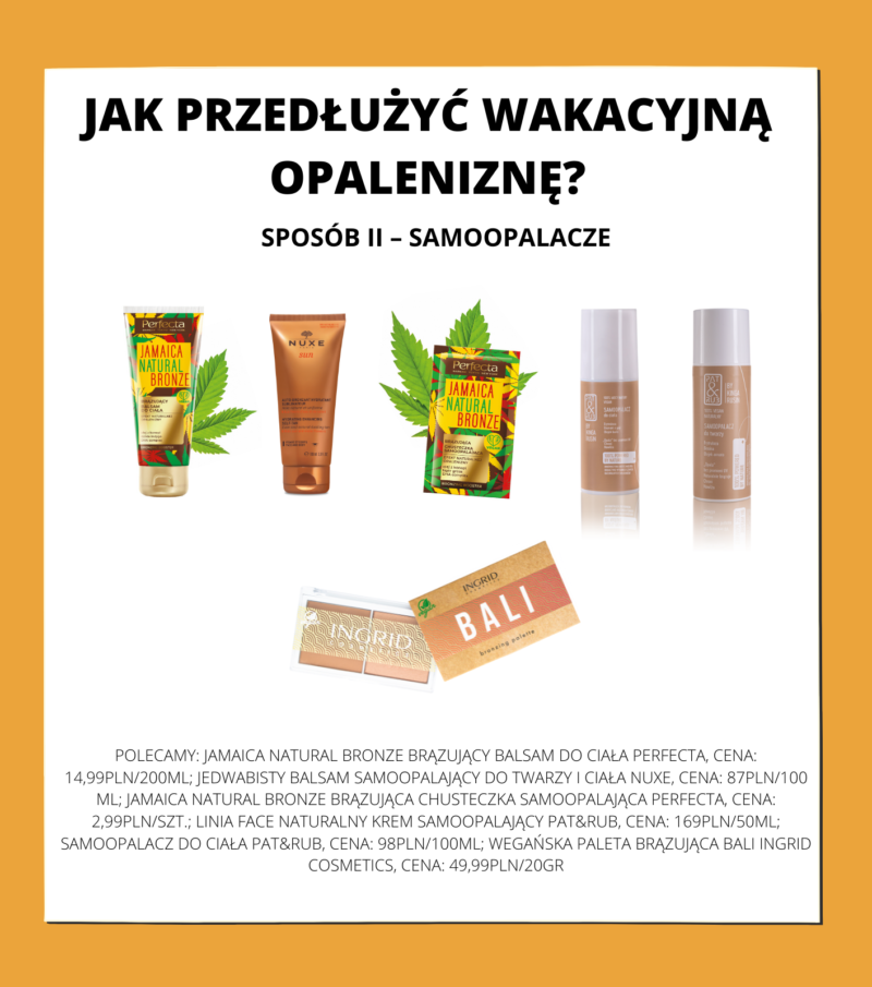 Kolejnym dobrym i bezpiecznym sposobem na przedłużenie opalenizny jest używanie samoopalaczy i balsamów brązujących. Główna różnica między nimi polega na intensywności ich działania. Samoopalacz daje zadowalający efekt już po jednej aplikacji, a balsam „opala” stopniowo. Natomiast oba nakładane na opaloną skórę utrwalą jej brązowy odcień, a ewentualne nierówności będą mniej widoczne. Jest to też znacznie zdrowszy sposób na pozyskanie opalenizny w porównaniu do godzin ekspozycji ciała na promienie słoneczne. Warto jednak pamiętać by używać kosmetyków brązujących zgodnie z zaleceniami producenta. Preparatów przeznaczonych do ciała nie zaleca się nakładać na twarz, gdyż skóra na niej jest znacznie cieńsza i nieodpowiedni kosmetyk może jej tylko zaszkodzić. Warto też pamiętać o tym, że nie każdy produkt będzie odpowiedni dla wszystkich karnacji, dlatego trzeba je dobrać do aktualnego koloru skóry.