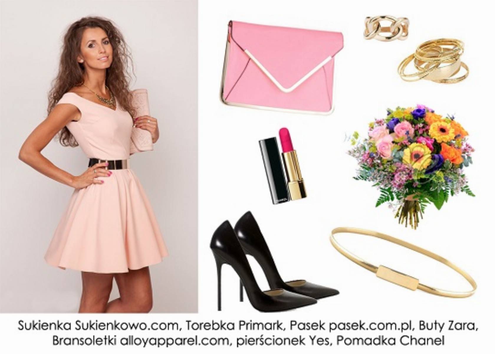 Nasza pierwsza propozycja to połączenie jesiennej czerni z bladoróżową sukienką i złotymi dodatkami, które idealnie wpisują się w złotą jesień. W tym okresie nasze ciała nie zapomniały jeszcze o promieniach słonecznych, są opalone, dlatego będą świetnie komponowały się z sukienką w kolorze bladego różu. Taka stylizacja sprawdzi się na weselu, imprezie firmowej czy rodzinnym obiedzie.