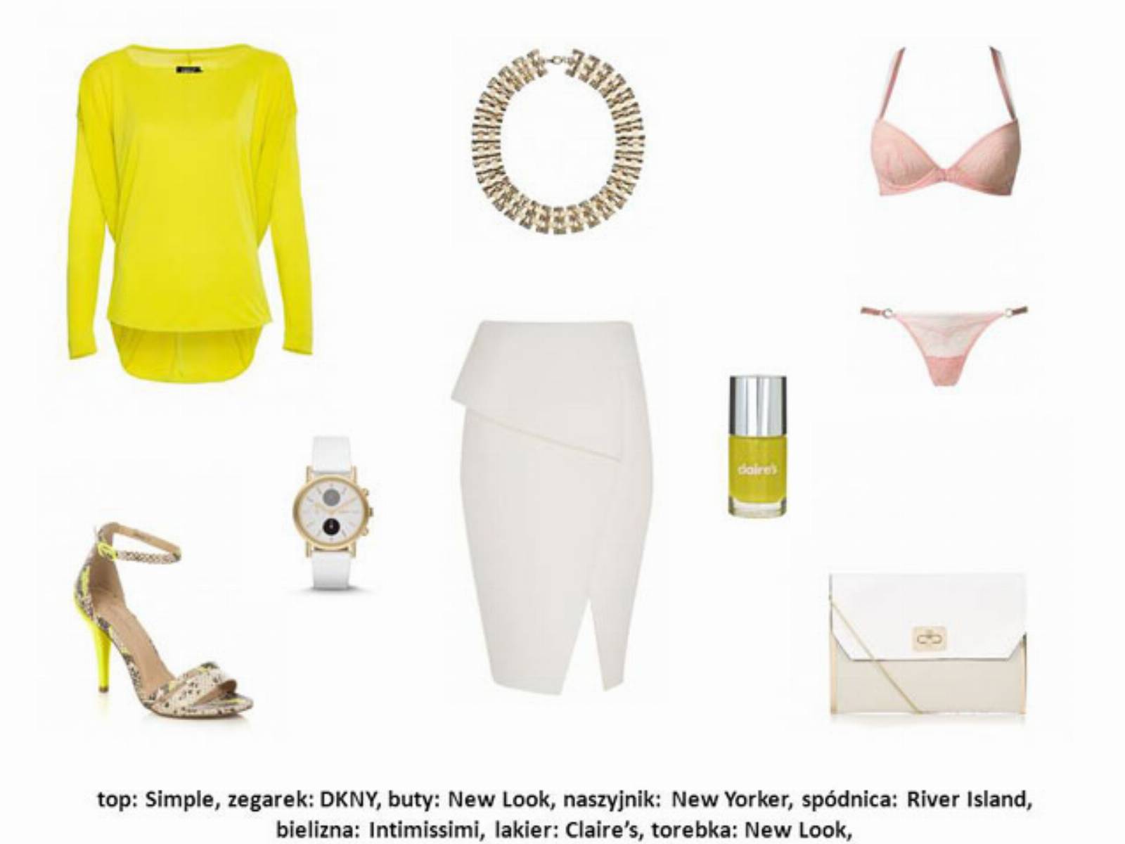 Tej wiosny królują wszystkie odcienie żółtego. Kombinacja luźnej bluzki w stonowanym żółtym kolorze i ołówkowej spódnicy z baskinką to kwintesencja elegancji. W połączeniu ze stylowymi dodatkami – białą kopertówką na delikatnym łańcuszku , gustownym zegarkiem i złocistym naszyjnikiem – doskonale sprawdzi się podczas eleganckiej kolacji. Stylizację dopełnią szpilki we wzór imitujący skórę węża z intensywnie żółtymi obcasami oraz limonkowy lakier na paznokciach.