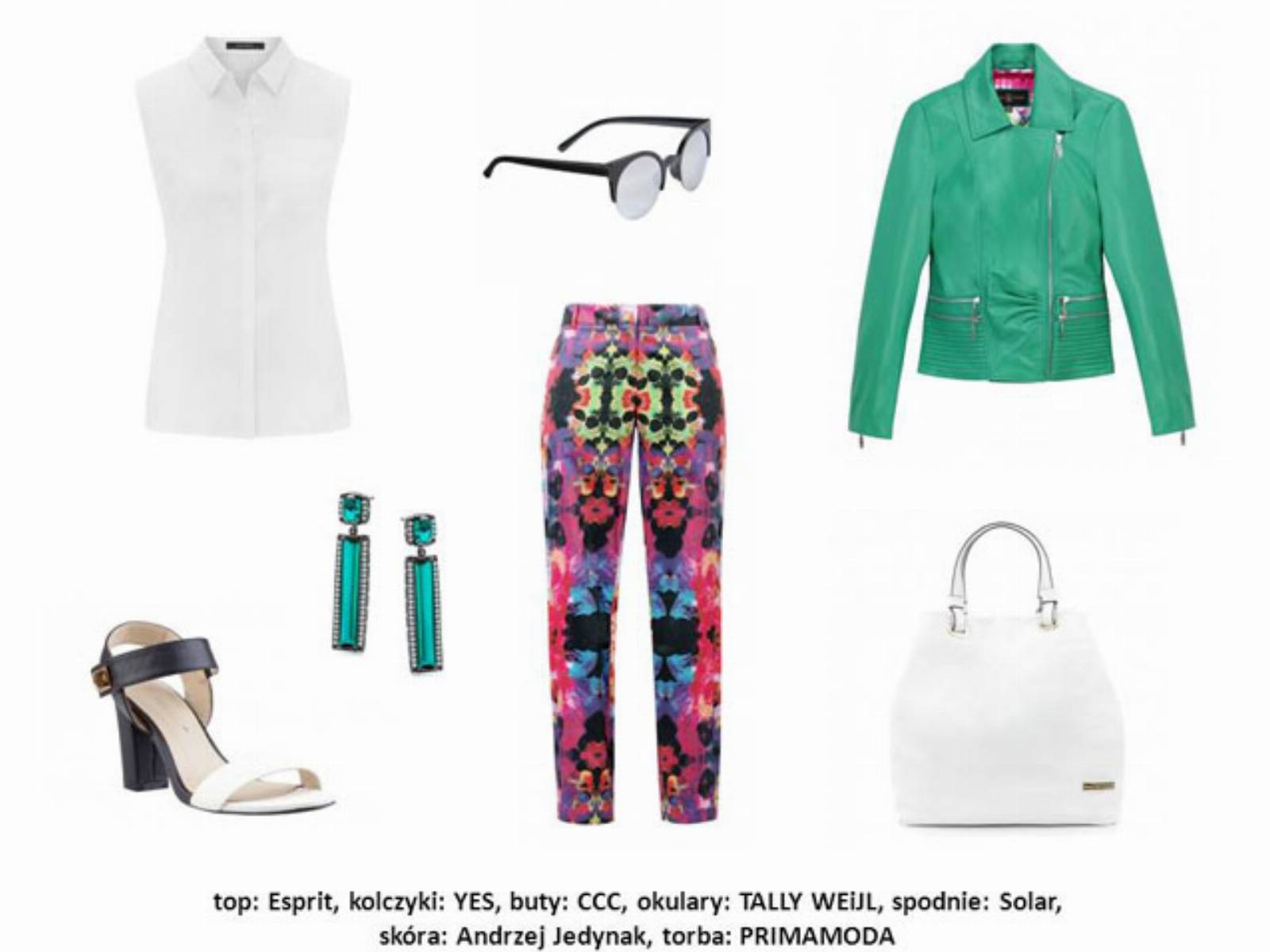 Pozwól sobie na odrobinę kolorowego szaleństwa w nadchodzące ciepłe dni. Długie spodnie o klasycznym kroju nabierają lekkości dzięki wielobarwnym nadrukom. Zestawione z wyrazistą, skórzaną kurtką w odcieniu intensywnej zieleni sprawią, że wyróżnisz się z tłumu. Zainwestuj również w modne dodatki. Sprawdzą się zarówno monochromatyczne, jak i różnobarwne akcesoria – eleganckie czarno-białe sandałki na obcasie czy jasna torebka typu shopper. Długie, subtelne kolczyki ze szmaragdowymi kamieniami nadadzą Twojej stylizacji szyku. Efekt końcowy? Idealny miejski look na co dzień.