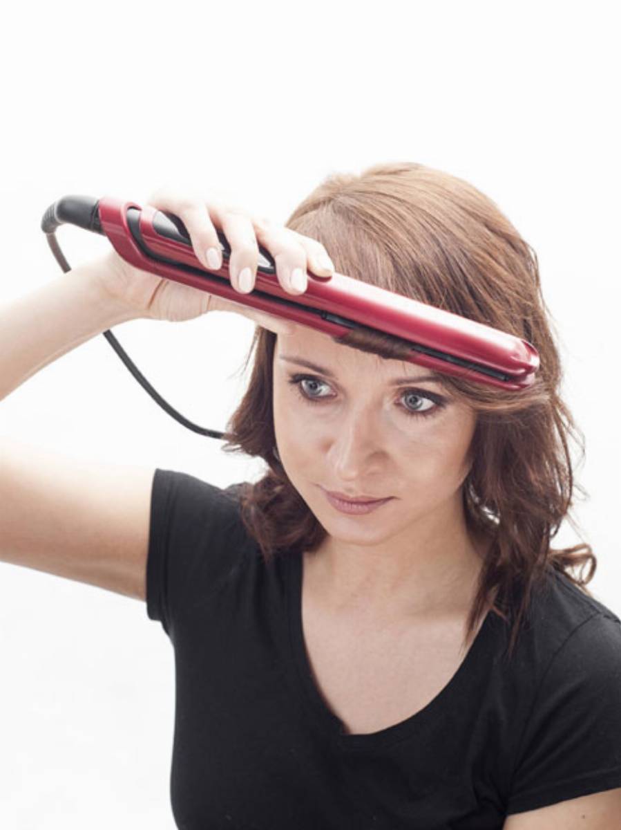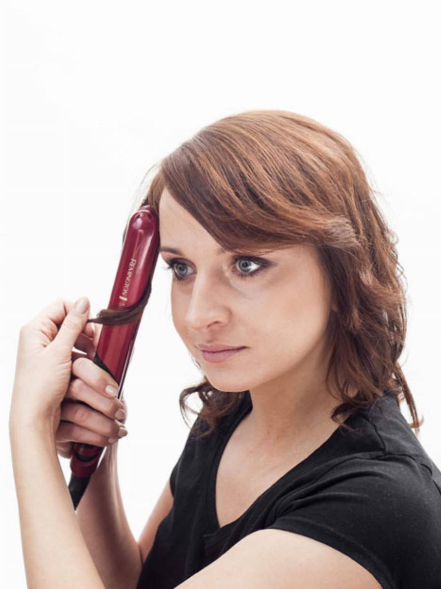 Zrób grzebieniem przedziałek lekko z boku. Używając prostownicy Remington Silk, delikatnie zakręć włosy. Wsuń kosmyk włosów między płytki prostownicy umieszczając ją jak najbliżej głowy. Następnie przesuwaj prostownicę w dół jednocześnie nią obracając. Podkręcaj włosy pasmo po paśmie.