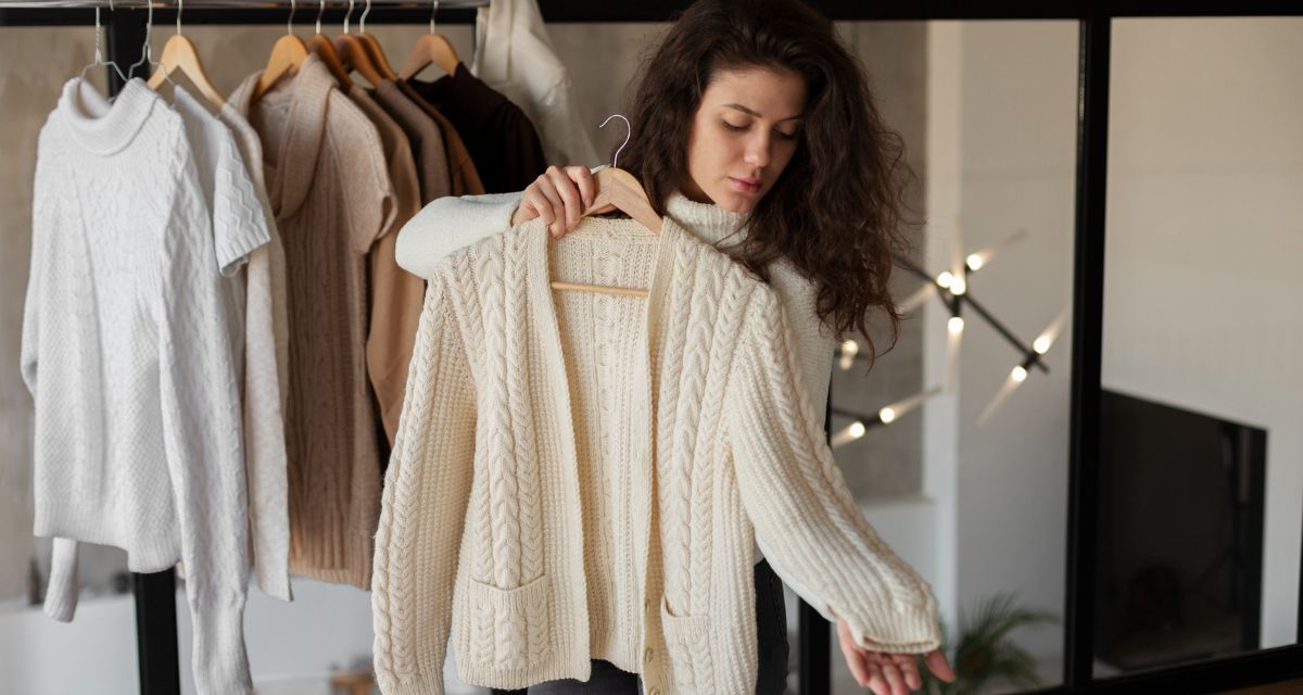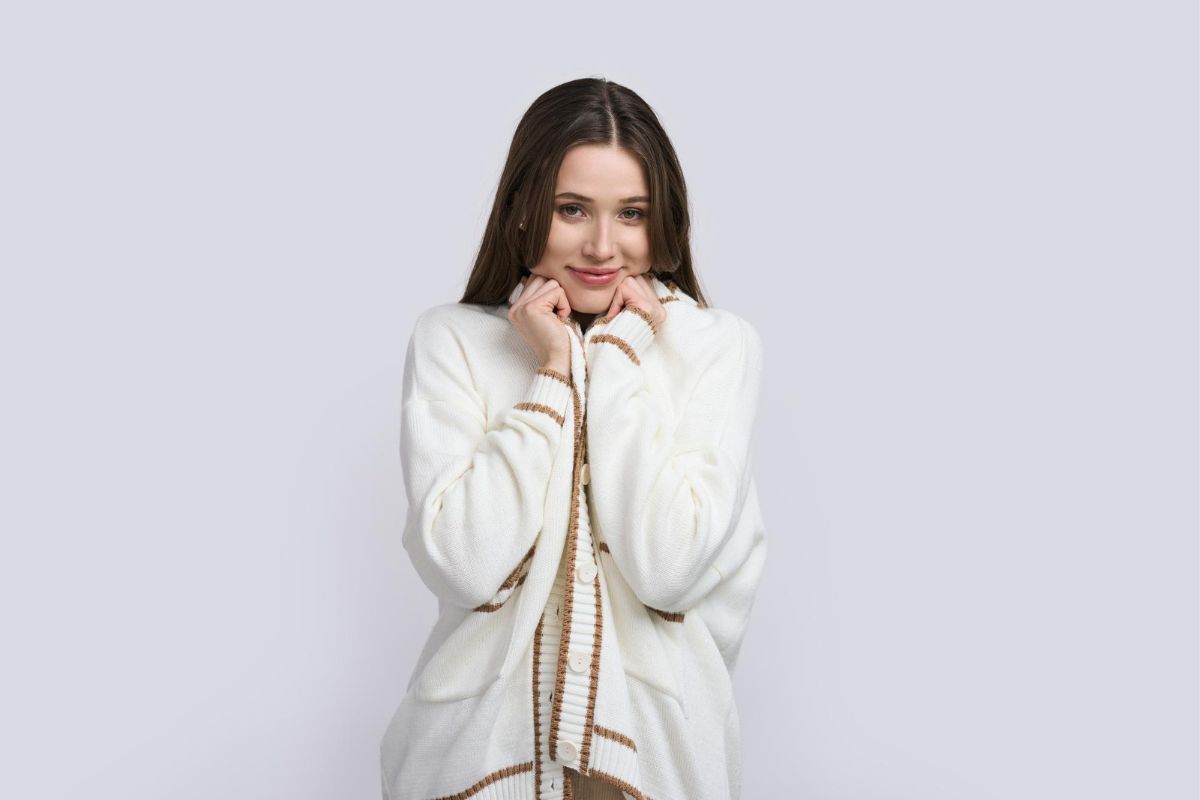 Jeśli chodzi o swetry i kardigany postaw na klasykę. Przy kupnie koniecznie zwróć uwagę na jakość materiału dokładnie czytając metkę ze składem. Jeśli nie masz do czynienia ze 100% wełną czy kaszmirem pamiętaj, żeby dodatek poliestru, akrylu czy poliamidu nie przekraczał 20%. Sweter powinien być miękki i przyjemny w dotyku, co będzie przekładało się na komfort jego noszenia.