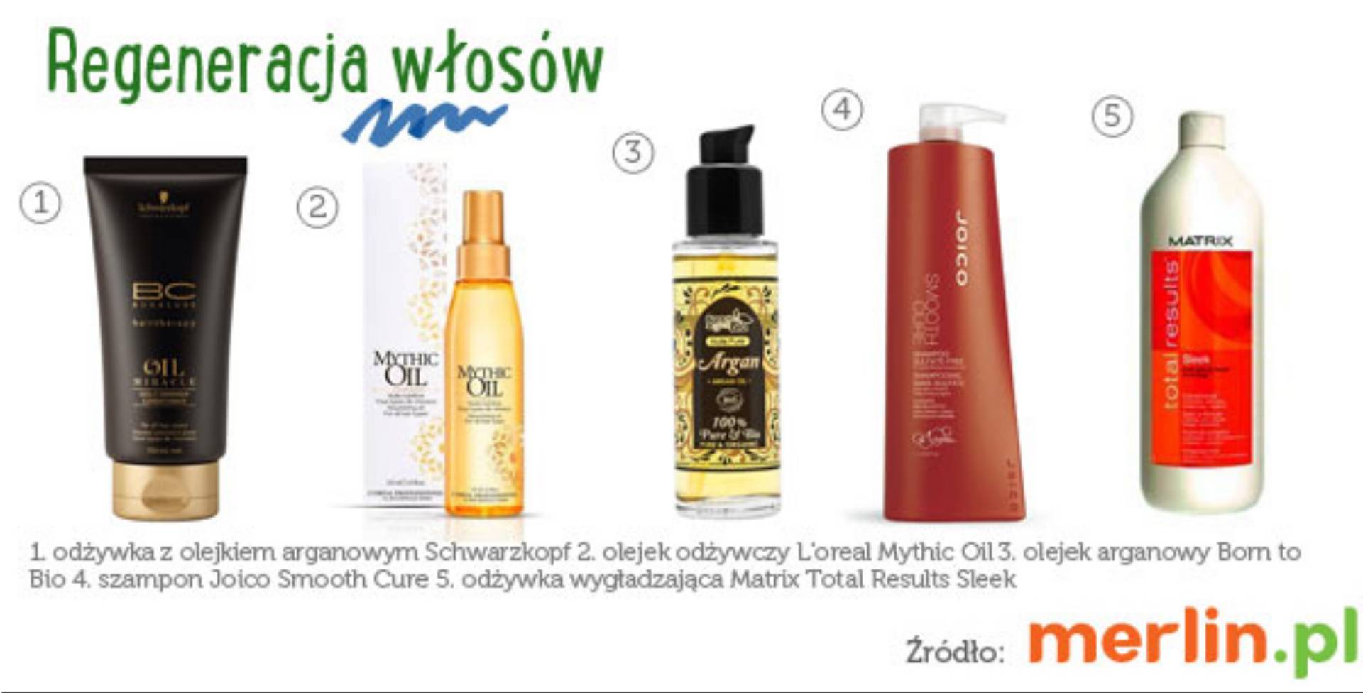 Wśród polecanych specyfików służących regeneracji znajduje się m.in. Total Results Sleek marki Matrix. – Dobroczynny wpływ na odżywienie włosów i przygotowanie ich na chłodniejsze dni, mają odżywki zawierające olejek arganowy lub awokado – dodają eksperci z działu Zdrowie i Uroda w Merlin.pl. Z kosmetyków dostępnych na rynku warto wymienić, np. BC Oil Miracle Schwarzkopf, Argan Born to Bio czy Mythic Oil firmy L’Oreal